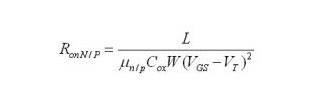 低導(dǎo)通電阻是模擬開關(guān)在音頻切換用途時的主要選擇因素。值得注意的是,導(dǎo)通電阻是針對具體的VCC 、VIN(電壓輸入)及給定負(fù)載電流而定義的。在晶體管級,RON為器是長度(L)、寬度(W)、電子與空穴遷移率、氧化層電容、門限電壓及信號電壓的函數(shù)。如下所示: