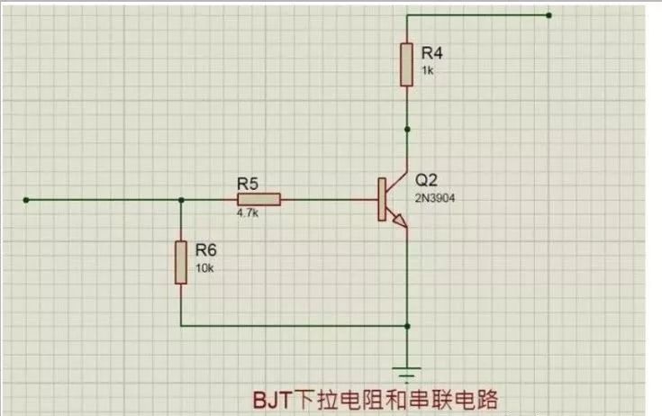 在BJT晶體三極管的基極端,上拉電阻和下拉電阻也起著至關重要的作用。在三極管的電路應用中,串接在基極上的電阻起限制基級電流的作用,如下圖中的R2所示,