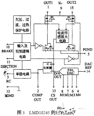 LMD18245 的內(nèi)部結(jié)構(gòu)框圖如圖3 所示。9 腳是電源端; 1、15 腳功率橋的輸出端; 12、5 腳分別是信號(hào)地和功率電路接地端; 4、6、7、8 是D/ A 轉(zhuǎn)換器的二進(jìn)制數(shù)據(jù)輸入端, 其中4 腳為二進(jìn)制數(shù)的最高位;10腳是緊急停止控制端,高電平有效; 11 腳為方向邏輯輸入端;3 腳上聯(lián)接一個(gè)并聯(lián)的RC 網(wǎng)絡(luò),可將單穩(wěn)脈沖寬度設(shè)置為: 1. 1 RC 秒。此外, 該芯片還提供了電流傳感器放大輸出端(13 腳) ,比較信號(hào)輸出端(2 腳) ,和數(shù)模轉(zhuǎn)換參考電壓輸入端(14 腳) 。