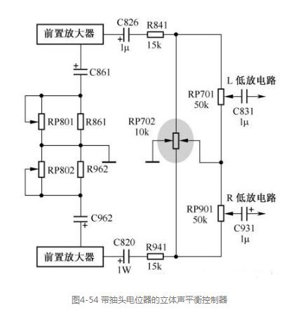 圖4-54所示是帶抽頭電位器的立體聲平衡控制器,RP702是平衡控制電位器,它的中心阻值處有一個(gè)抽頭,且抽頭接地。