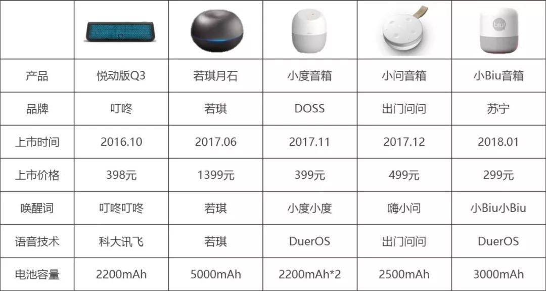 2016年10月,叮咚發(fā)布靈動(dòng)版A3和悅動(dòng)版Q3,其中Q3內(nèi)置2200mAH電池,可連續(xù)播放8小時(shí),同時(shí)搭配Flash charging快充技術(shù)。2017年,帶電池的便攜音箱逐漸增多,包括若琪的月石、DOSS的小度音箱、出門問問的小問音箱等。進(jìn)入2018年,蘇寧發(fā)布小Biu智能音箱,搭載DuerOS2.0,配備3000mAh大容量鋰電池,在沒有電源的情況下可連續(xù)工作6小時(shí)。
