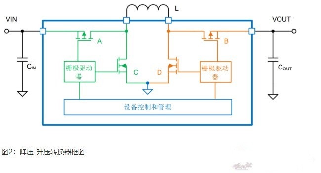 降壓-升壓轉(zhuǎn)換器將降壓轉(zhuǎn)換器(圖1中的綠色部分)與升壓轉(zhuǎn)換器(圖1中的橙色部分)合并在同一結(jié)構(gòu)中,從而可以有效地升高和降低輸出電壓?刂骗h(huán)路可以根據(jù)實(shí)際的輸入電壓和編程設(shè)定的輸出電壓來決定設(shè)備是否需要在降壓或升壓模式下運(yùn)行。