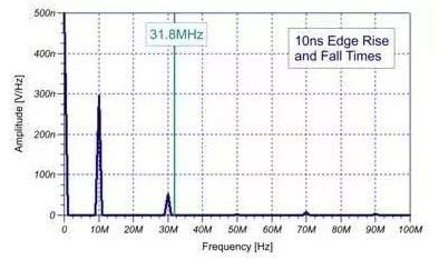 10ns邊緣率時方程式結(jié)果為約31.8MHz。曲線圖顯示,最后一次明顯諧波出現(xiàn)在30MHz。同時,1ns邊緣率時方程式結(jié)果為318MHz最大頻率(圖2所示)。如果您的電路易受318MHz頻帶內(nèi)產(chǎn)生的頻率影響,則EMI諧波可能會使您的電路出現(xiàn)干擾。