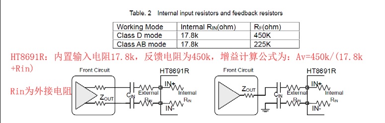 比如:都工作在防破音模式,HT8691是1.1V左右,HT8691R是2V左右。4. 放大倍數(shù)(增益)設置區(qū)別: