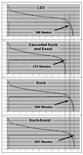 圖3為4種解決方案中鋰離子電池電壓下降到3.3V時的放電曲線與運行時間的對應(yīng)關(guān)系。