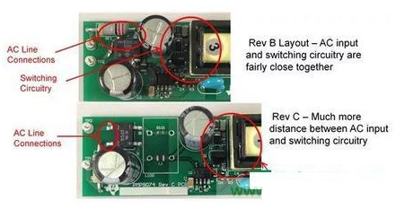 圖 2:從電路板布局進(jìn)行 EMI 掃描,其中 AC 輸入與開關(guān)電路距離較近
