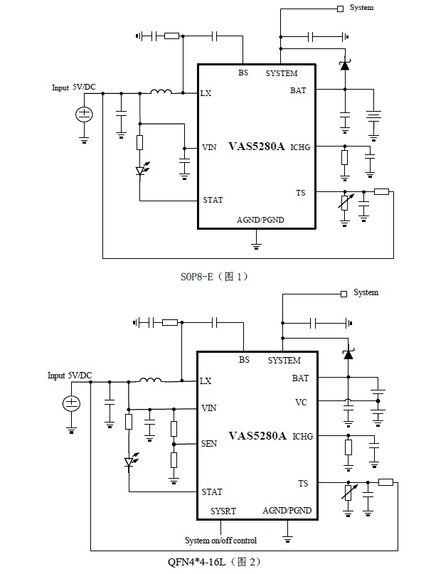 VAS5280A 提供了充電路徑管理,SYSTEM 引腳為供電腳,適配器接入時(shí),當(dāng) VBAT< 2V,SYSTEM輸出 4.2V;當(dāng) 2V6V,SYSTEM 輸出 VBAT+0.1V 電壓。以保證電池深度放電后適配器的接入能瞬間為系統(tǒng)提供啟動(dòng)電壓。