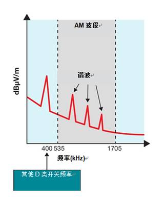 如圖4所示,在400-kHz范圍內(nèi)開關(guān)的傳統(tǒng)D類放大器產(chǎn)生直接位于AM波段內(nèi)的諧波。這些諧波會產(chǎn)生降低AM接收器靈敏度的干擾信號,從而妨礙AM廣播電臺接收。因此,必須在這些400-kHz D類放大器設(shè)計上實施某種類型的EMI避免技術(shù),以減輕這些AM波段諧波的影響。