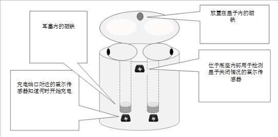 TWS的新功能是圍繞充電和進行的創(chuàng)新。充電盒蓋的開合可以用來進行藍牙連接的開啟或關(guān)閉,而入盒/出盒檢測可以判斷是否停止充電以及左右耳配對。其他傳感器技術(shù)可能無法經(jīng)濟有效地通過合適的靈敏度來正確實現(xiàn)這些功能,所以選擇合適的傳感器至關(guān)重要。圖2顯示了TWS傳感器的布置。