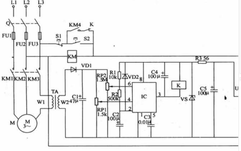保護控制電路由時基集成電路lC、電阻器Rl、R2、二極管VD2、電容器C2-C4、繼電器K和交流接觸器KM組成。S1為停止按鈕,S2為起動按鈕。按動S2時,交流接觸器KM通電吸合,其常開觸頭KMl-KM4接通,電動機M通電運轉。KM的工作電壓還經T降壓、UR整流、C5濾波、R3限流及VS穩(wěn)壓后,為IC提供+l2V(Vcc)工作電源。松開S2后,KM4觸頭和K的常閉觸頭將電源鎖定,KM保持吸合狀態(tài)。在電動機M正常運行時,TA的W2繞組上的感應電壓較低,IC的6腳電壓低于2Vcc/3,3腳輸出低電平,K不吸合。當Ll相或L2相電壓缺相時,L3相電流將迅速增大(約為正常電流的173倍),使TA的W2繞組上的感應電壓增高,IC的6腳電壓高于2Vcc/3,3腳由高電平變?yōu)榈碗娖,K吸合,其常閉觸頭斷開,KM斷電釋放,其常開觸頭KMl-KM4將電動機M的工作電源切斷。若L3相電壓缺相時,TA無感應電壓輸出,相當于IC的4腳加上了低電平,其3腳輸出低電平,便K吸合,KM釋放,電動機M停止運轉。當電動機M的拖動負荷變重、超過電動機的額定功率時,三相線Ll-L3上的電流同時增大。當電流增大至額定電流的1?2倍左右時,IC的6腳電壓將高于2Vcc/3,3腳輸出低電平,K吸合,KM釋放,電動機M停轉保護。