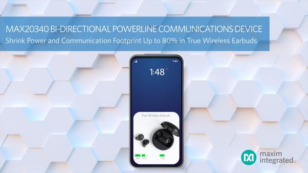 Maxim Integrated Products, Inc (NASDAQ: MXIM)宣布推出業(yè)界最小的2引腳雙向直流電力線通信(PLC)器件MAX20340,在超低功耗便攜式和可穿戴應用中將充電底座的供電和通信接口尺寸減小80%。通過單根線路供電并進行數(shù)據(jù)通信,MAX20340省去了充電底座與真無線耳機、手環(huán)及其他小型可穿戴低壓設備間通信所需的引腳和分立器件。與最接近的競爭方案相比,該產(chǎn)品有效簡化設計,且為每只耳機節(jié)省13mm2的占位面積。