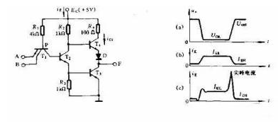 輸出級的 T3、T4 管短設(shè)計內(nèi)同時導(dǎo)通。在與非門由輸出低電平轉(zhuǎn)向高電平的過程中,輸入電壓的負(fù)跳變在 T2 和 T3 的基極回路內(nèi)產(chǎn)生很大的反向驅(qū)動電流,由于 T3 的飽和深度設(shè)計得比 T2 大,反向驅(qū)動電流將使 T2 首先脫離飽和而截止。T2 截止后,其集電極電位上升,使 T4 導(dǎo)通?墒谴藭r T3 還未脫離飽和,因此在極短得設(shè)計內(nèi) T3 和 T4 將同時導(dǎo)通,從而產(chǎn)生很大的 ic4,使電源電流形成尖峰電流。圖中的 R4 正是為了限制此尖峰電流而設(shè)計。