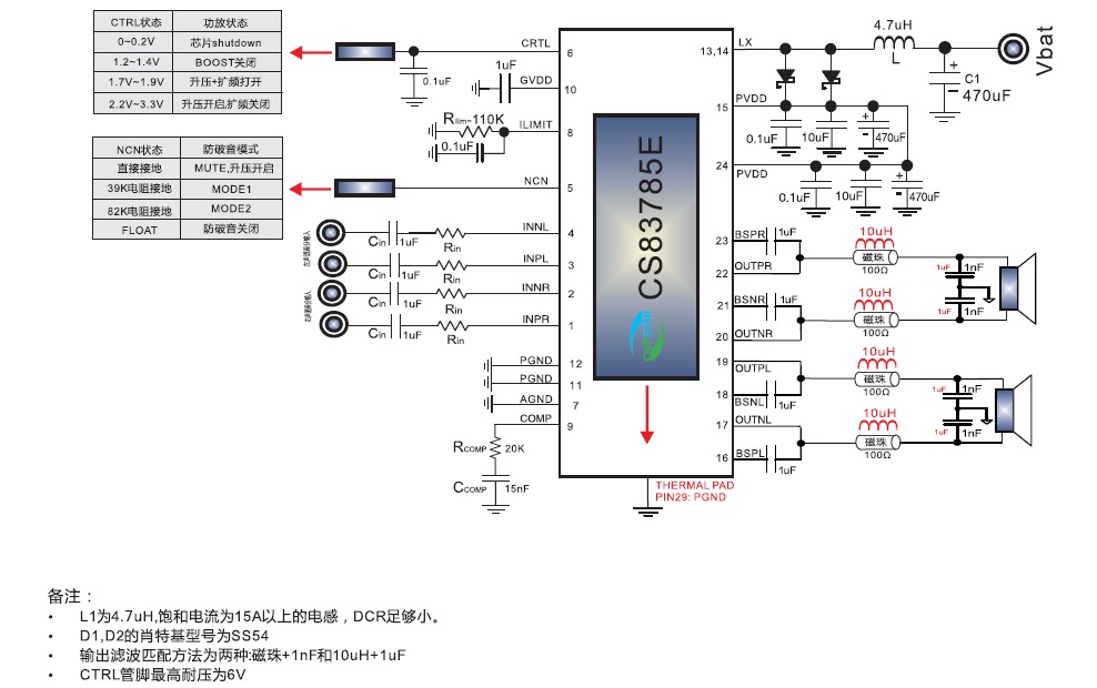 CS83785E是一款兼顧12V適配器供電應(yīng)用針對(duì)單節(jié)鋰電應(yīng)用 ,帶兩種防破音模式 ,擴(kuò)頻模塊 ,內(nèi)置BOOST升壓模塊,R類立體聲音頻功率放大器?梢詾4Ω 的負(fù)載提供最高 2X10W的恒定功率.CS83785E管腳完全兼容CS83711E,為音頻子系統(tǒng)的功放設(shè)計(jì)以及終端產(chǎn)品的升級(jí)更換提供了可觀的功率裕量以及最大的便利性。CS83785E的全差分架構(gòu) 和極高的PSRR有效地提高了CS83785E對(duì)RF噪聲的抑制能力。無需濾波器的PWM調(diào)制結(jié)構(gòu)及內(nèi)置的BOOST升壓模塊,以及CS83785E采用專有的AERC((Adaptive Edge Rate Control)技術(shù) ,在音頻全帶寬范圍內(nèi)極大地降低了EMI的干擾,對(duì)60cm的音頻線,在FCC的標(biāo)準(zhǔn)下具有超過20dB的裕量,另外CS83785E內(nèi)置了過流保護(hù),短路保護(hù)和過熱保 護(hù),有效的保護(hù)芯片在異常的工作條件下不被損壞。