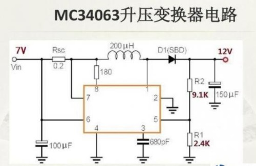 下面以MC34063舉個(gè)例子,MC34063可用于升壓或降壓電壓電源變換,電源輸入范圍2.5V~40V,輸出電壓范圍1.25V~40V,輸出電流1.5A,其輸出電壓公式為VOUT=1.25×(1+R2/R1)。