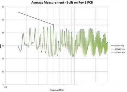 圖 2:從電路板布局進(jìn)行 EMI 掃描,其中 AC 輸入與開(kāi)關(guān)電路距離較近