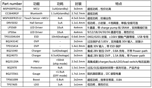 與充電盒的設計相比,耳機端的空間更小,對芯片的封裝和功耗提出了更嚴格的要求。針對這種情況,TI在耳機端的方案匯總?cè)缦拢?/font>