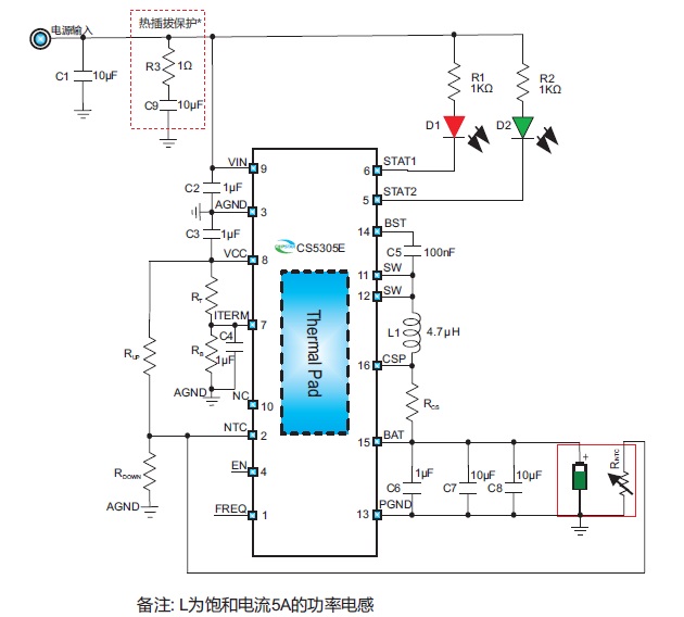 CS5305E具有完善的保護(hù)功能,包括輸入欠壓和過(guò)壓保護(hù)、電池過(guò)壓和短路保護(hù)、電池溫度保護(hù)、芯片溫度調(diào)節(jié)和保護(hù),同時(shí)還具備電池反接保護(hù)功能。此外芯片通過(guò)外接的兩路LED指示燈,可對(duì)充電過(guò)程實(shí)現(xiàn)全程監(jiān)控。