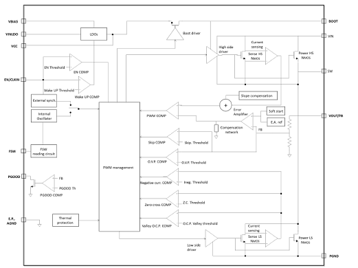 The L6983 is an easy-to-use synchronous monolithic step-down regulator capable of delivering up to 3 ADC to the load. Its wide input voltage range makes the device suitable for a broad range of applications. The device implements peak current mode architecture in a QFN16 3x3 package with internal compensation to minimize design complexity and size.