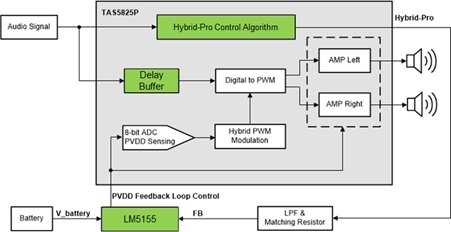 TAS5825P為德州儀器2019年新推出的數(shù)字輸入D類功放芯片。該芯片內(nèi)置強大的音頻 DSP 內(nèi)核,實現(xiàn)了一種稱為 Hybrid-Pro 的專有算法。Hybrid-Pro算法可檢測即將發(fā)生的音頻功率需求,并通過反饋引腳 (HPFB) 為DC/DC變換器提供 PWM 控制信號來調(diào)整輸出電壓(即D類功放的電源電壓 PVDD)。TAS5825P支持高達 4ms 的延遲緩沖器 (Delay Buffer),以提前查看音頻信號并防止音頻削波失真。