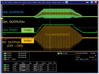 圖7. TAS5825P 實現(xiàn)實現(xiàn)動態(tài)調(diào)壓音頻功放的實驗波形