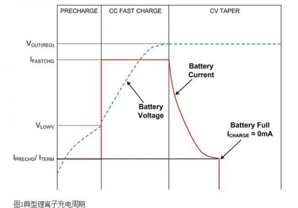 鋰離子電池要求專門的充電周期,以完成安全充電并最大化電池運用時間。電池充電分兩個階段:安穩(wěn)電流 (CC) 和安穩(wěn)電壓 (CV)。電池位于徹底充溢電壓以下時,電流經過穩(wěn)壓進入電池。在CC辦法下,電流經過穩(wěn)壓達到兩個值之一。假定電池電壓非常低,則充電電流下降至預充電電平,以習慣電池并避免電池損壞。該閾值因電池化學特點而不同,一般取決于電池制造廠商。一旦電池電壓升至預充電閾值以上,充電便升至快速充電電流電平。典型電池的最大建議快速充電電流為1C(C=1 小時內耗盡電池所需的電流),但該電流也取決地電池制造廠商。典型充電電流為~0.8C,目的是最大化電池運用時間。對電池充電時,電壓上升。一旦電池電壓升至穩(wěn)壓電壓(一般為4.2V),充電電流逐步減少,一同對電池電壓進行穩(wěn)壓以避免過充電。在這種辦法下,電池充電時電流逐步減少,一同電池阻抗下降。假定電流降至預訂電平(一般為快速充電電流的10%),則終止充電。咱們一般不對電池浮充電,因為這樣會縮短電池運用壽數。圖1 以圖形辦法闡清楚典型的充電周期。