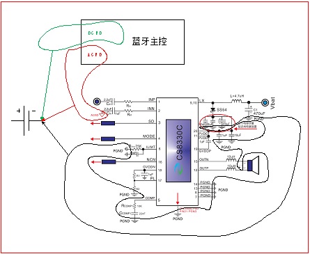 電路板上所有的器件以及單元電路都是以地線作為參考電位。原理上地線作為零電位,器件之間不會(huì)產(chǎn)生由于地線的耦合干擾。但實(shí)際是不可能的,所有引線都具有阻抗,只要地線有電流流過(guò),就會(huì)產(chǎn)生相應(yīng)的壓降。電路走線還會(huì)形成電感,這意味著電流從電源正極流向負(fù)載,然后返回電源負(fù)極,在整個(gè)電流通道上存在一定的電感。工作在較高頻率時(shí),電感將增大地線阻抗,比如DC-DC升壓電路中電源-電感-MOS管-地通路。如果不分地,特別整個(gè)地平面不完整,音頻功放信號(hào)又是單端輸入的情況下,數(shù)字電路以及升壓電路的開(kāi)關(guān)噪聲就會(huì)通過(guò)地線耦合到音頻功放的輸入端或者電源端,最終喇叭輸出明顯的底噪聲。所以分地是一個(gè)處理底噪聲的好辦法。以?xún)?nèi)置升壓音頻功放CS8330用于藍(lán)牙音箱為例,可將整個(gè)PCB板地線分成三部分:DGND, PGND, AGND。DGND是主控?cái)?shù)字電路部分,包括藍(lán)牙射頻部分地線可跟數(shù)字地接一起。PGND主要是音頻功放DC-DC升壓部分以及功率放大部分,包括外圍的濾波電容。充電部分可在功放的前端接一起,也可單獨(dú)一部分。AGND包括藍(lán)牙主控芯片ADC, DAC,MIC部分模擬地以及音頻功放內(nèi)部輸入端預(yù)放部分模擬地。最終DGND,PGND,AGND三大塊在電池或者電源輸入端匯總一點(diǎn)接地。如下圖所示: