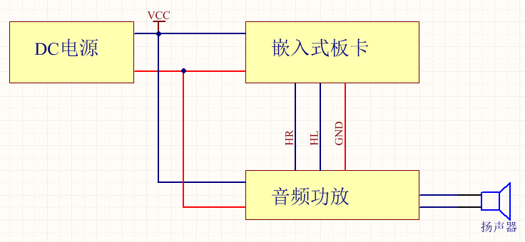 如下圖所示,嵌入式板卡與功放使用同一個(gè)電源,音頻信號(hào)由嵌入式板卡通過3.5MM接口輸出,給音頻功放。