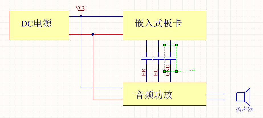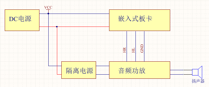 嵌入式板卡的供電由DC電源提供,音頻功放的電源由DC-DC隔離電源提供,這樣就切斷了功放與嵌入式板卡之前的地,行成不了環(huán)地,這樣這個(gè)環(huán)地噪聲也就沒有了。