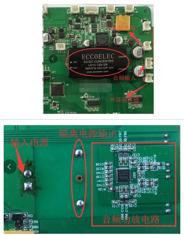 在我拆解小船機(jī)器人時(shí)候,發(fā)現(xiàn)小船就是用的這種電源隔離方式設(shè)計(jì)音頻的,實(shí)物拍攝如下圖所示。