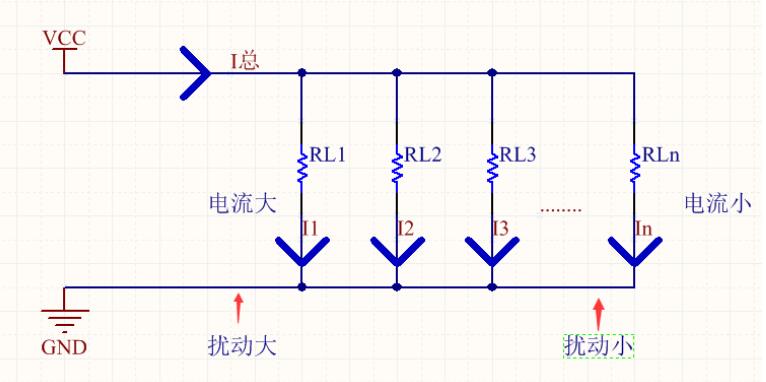 所以,要求嵌入式板卡的電源以及地需要設(shè)計(jì)合理,如上圖所示,電源輸入總電流為I總,分別流向負(fù)載,RL1、RL2….RLn,均會(huì)產(chǎn)生一個(gè)對(duì)應(yīng)的電流I1,I2……In。