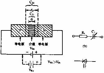 變?nèi)荻䴓O管的簡(jiǎn)化等效電路及電路符號(hào)分別如圖1(b)、(c)所示。圖中用一只可變電容來(lái)表示結(jié)電容。R2是半導(dǎo)體材料的電阻。
