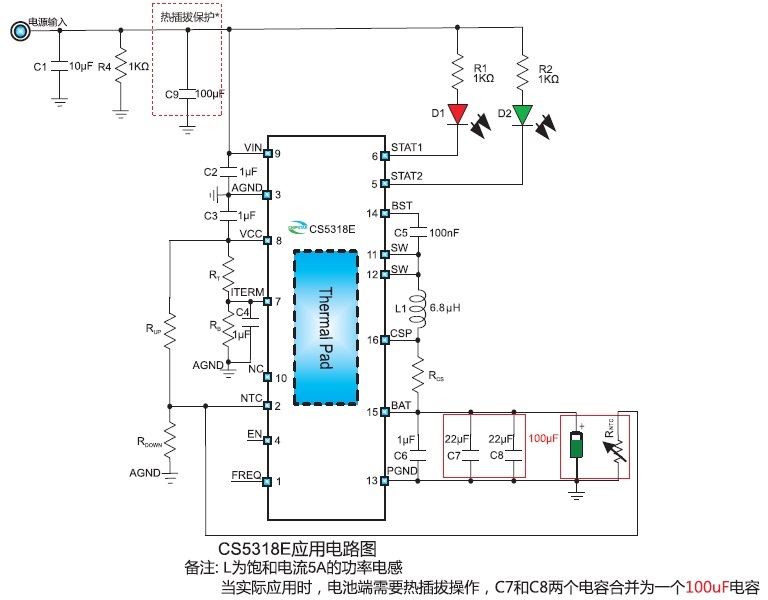 CS5318E具有完善的保護(hù)功能,包括輸入欠壓和過壓保護(hù)、電池過壓和短路保護(hù)、電池溫度保護(hù)、芯片溫度 調(diào)節(jié)和保護(hù),同時還具備電池反接保護(hù)功能。此外芯片通過外 接的兩路LED指示燈,可對充電過程實現(xiàn)全程監(jiān)控。