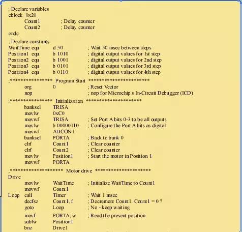 列表1給出了控制程序的匯編源代碼,該程序每50毫秒旋轉(zhuǎn)電機一次。首先,程序會將微控制器的數(shù)字輸出初始化為表4中第一步的值,然后每隔50毫秒(此時間常數(shù)由程序中的常量waitTime定義)按照正確的順序循環(huán)輸出數(shù)字信號。若需使電機反向旋轉(zhuǎn),只需按與表4所示相反的順序輸出數(shù)字信號即可。