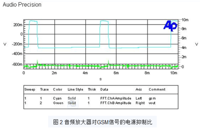 在 TDMA 和 GSM 手機中,最嚴重的電源電壓噪聲來自 RF 級的開與關。GSM 電話的開關頻率為 217Hz。當 RF 功率放大器接通時,從電源獲得高電流,這時電源下降高達 500mV。PSRR 差的音頻放大器將在揚聲器產生大于 217Hz 的諧波“咔咔”噪聲。圖 2為PSRR為60dB的放大器對GSM信號的抑制能力。