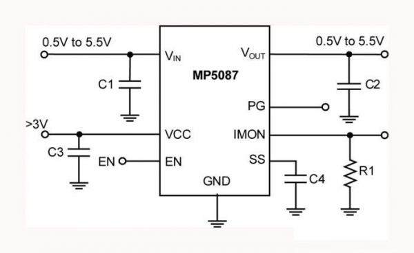 MP5087 可在0.5V至5.5V輸入工作電壓范圍內(nèi)提供7A電流負(fù)載保護(hù)的負(fù)載開關(guān)