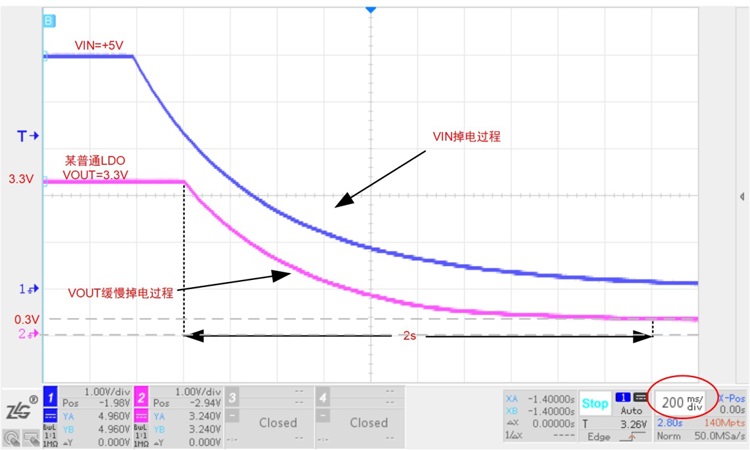 現(xiàn)在使用引腳封裝兼容的ZL6205直接替換上面圖1的普通LDO,然后在相同的電源下進(jìn)行掉電測(cè)試。圖4實(shí)測(cè)相同的電路下ZL6205的掉電過程。其中藍(lán)色線(通道1)為掉電時(shí)輸入的電壓波形,粉色線(通道2)為掉電時(shí)輸出電壓波形。