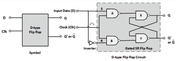 所以D觸發(fā)器基本就是S-R觸發(fā)器的改進版。在S-R出發(fā)其中,S=0和R=0的情況是不允許的,因為這會讓觸發(fā)器的行為充滿不確定性。該問題在D觸發(fā)器中解決了,通過在兩個輸入之間加入一個逆變器(見上方原理圖)。而第二輸入則給到去NAND門的時鐘脈沖。此處的逆變器是為了避免輸入上的相同邏輯電平,這樣"S=0同時R=0"的情況就不會發(fā)生了。