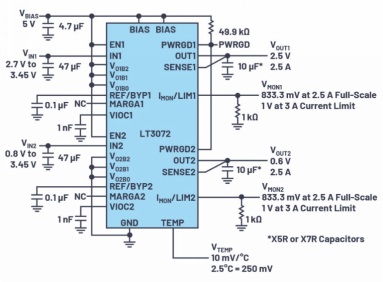 LT3072雙通道2.5 A線性穩(wěn)壓器能夠滿足數(shù)字IC電源的挑戰(zhàn)性需求,即使LT3072采用前置穩(wěn)壓器輸入電源,也可以進行與硬件無關(guān)的輸出電壓調(diào)整。LT3072具有UltraFast™瞬態(tài)響應(yīng)和80 mV的低壓差,使其能夠在負載快速變化時輕松產(chǎn)生精確調(diào)節(jié)的電源電壓。