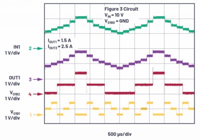 圖4.圖3所示電路的動態(tài)測試。跡線顯示,通過軟件對三態(tài)引腳VO1B2和VO1B1(VO1B0接地)進行更改如何實現(xiàn)對LT3072的OUT1電壓調(diào)整。反過來,LT3072動態(tài)控制LT8616通道1輸出,該輸出對LDO穩(wěn)壓器的IN1輸入進行預調(diào)節(jié)。這樣,LDO穩(wěn)壓器的IN1電壓保持在一個高于LDO穩(wěn)壓器OUT1的固定壓差,從而可實現(xiàn)高效率和高負載瞬變性能,所有這一切無需對硬件進行任何更改。