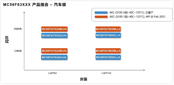 56F83xxx汽車級產(chǎn)品將包含AEC-Q100 1級和2級的版本。其中AEC-100 2級已經(jīng)量產(chǎn),AEC-Q100 1級產(chǎn)品將于2021年第一季度實現(xiàn)量產(chǎn)。 |