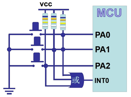這樣就必須引入外部中斷的設(shè)計(jì)方案,一個(gè)按鍵的設(shè)計(jì)原理圖如下: