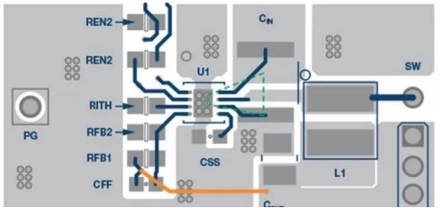 不得在電感下方(PCB 表面或下方都不行)、在內(nèi)層里或 PCB 背面布設(shè)敏感的控制走線。受電流流動(dòng)的影響,線圈會(huì)產(chǎn)生磁場(chǎng),結(jié)果會(huì)影響信號(hào)路徑中的微弱信號(hào)。在開關(guān)穩(wěn)壓器中,一個(gè)關(guān)鍵信號(hào)路徑是反饋路徑,其將輸出電壓連接到開關(guān)穩(wěn)壓器 IC 或電阻分壓器。