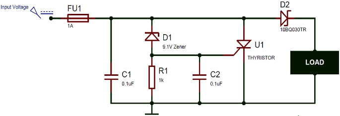 而何種電壓下產(chǎn)生短路則取決于齊納電壓。電路由一個(gè)晶閘管構(gòu)成,晶閘管會(huì)直接連在輸入電壓和地之間,但晶閘管因?yàn)殚T(mén)極接地所以默認(rèn)為關(guān)斷狀態(tài)。當(dāng)輸入電壓超過(guò)齊納電壓后,齊納二極管導(dǎo)通,因此電壓加到晶閘管門(mén)極,使得輸入電壓與地之間產(chǎn)生短路。短路會(huì)從電源中產(chǎn)生龐大的電流,從而熔斷保險(xiǎn)絲,使得負(fù)載與電源斷開(kāi)。