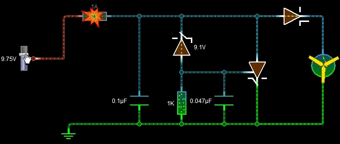 以上圖片展示了過(guò)壓保護(hù)的過(guò)程。電壓增加到9.75V后,保險(xiǎn)絲熔斷。其中每一個(gè)元器件的功能如下: