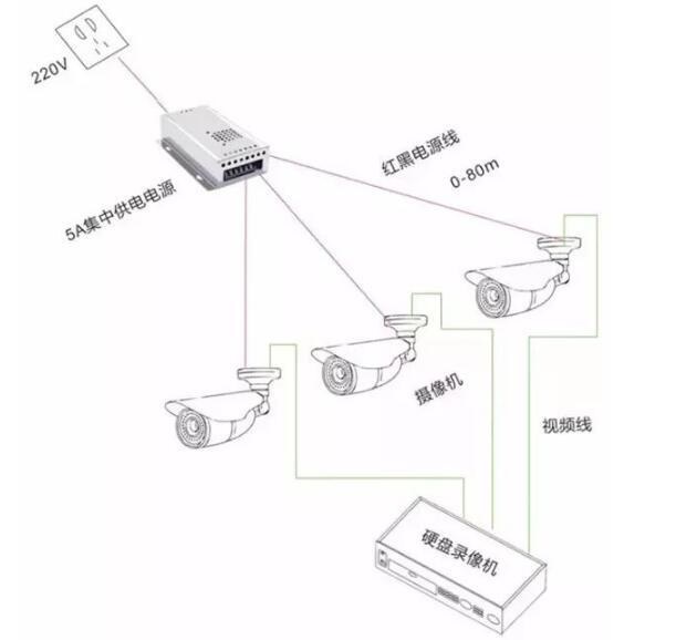 通常懂的人都知道集中供電模式是在 220V 電源處接 12V 集中電源一個(gè),再用 2*1.0 紅黑電源線分別接給攝像頭,12V 供電距離不可超過(guò) 100 米。在接個(gè)單個(gè)電源線接頭,再把單個(gè)電源線接頭和監(jiān)控?cái)z像頭電源接頭相連接即可。集中供電方式是指在監(jiān)控室或某個(gè)中間點(diǎn)采用 12V 開關(guān)電源向前端負(fù)載集中供電。與獨(dú)立供電模式相比,最大的差別在于一個(gè)電源可以為多個(gè)攝像機(jī)提供電力供應(yīng)。