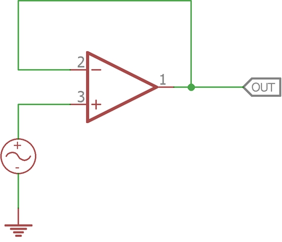 我們來看下面的放大器電路。這是一個簡單的負反饋同相運放電路。這種配置方式為單位增益跟隨器。