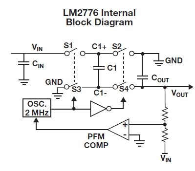 電荷泵芯片通常內(nèi)部組成主要為電容和開關(guān),通過(guò)開關(guān)的開啟關(guān)閉來(lái)控制電荷泵內(nèi)部電容的充放電(即開關(guān)電容)來(lái)產(chǎn)生負(fù)輸出電壓。以下為 LM2776 的內(nèi)部結(jié)構(gòu)示意圖為例,在充電階段,S1 與 S3 開關(guān)閉合 (S2 和 S4 開關(guān)為斷開狀態(tài)),開關(guān)電容被連接在輸入電壓與地之間, 充電電容被充電到輸入電壓 VIN;在放電階段,S2 和 S4 開關(guān)閉合 (S1 和 S3 為斷開狀態(tài)),此時(shí)開關(guān)電容的陽(yáng)極接地,陰極接 VOUT,若負(fù)載電流為 0,VOUT 即為 -VIN。若負(fù)載電流不為 0,計(jì)算 VOUT 的值還需考慮 MOSFET 開關(guān)的寄生電阻,電容的 ESR 以及電容充放電時(shí)的電荷損失等。