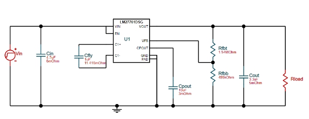 您還可以通過(guò)使用 TI 免費(fèi)在線仿真軟件 WEBENCH 來(lái)創(chuàng)建 LM27761 的定制設(shè)計(jì),進(jìn)行線上仿真,生成可導(dǎo)出的 PCB 文件及核算 BOM。如下方為使用 WEBENCH 設(shè)計(jì)出來(lái)的 LM27761 參考電路,VIN=5.5V, VOUT=-5V, IOUT=50mA。