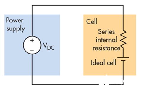 來看看測試環(huán)境(圖 2)。這是一個很簡單的測試環(huán)境,電源與需要充電的電池相連。常將電池視作含有串聯(lián)內(nèi)阻的理想電池?墒褂脤S秒姵販y試設(shè)備或LCR 表通過交流電阻(ACR)測量獲得內(nèi)部電阻值。