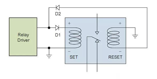 操作的原理很簡單。當(dāng)線圈驅(qū)動器輸出電壓為正時,電流流過二極管D1以激勵設(shè)定線圈,而復(fù)位線圈不供電,因?yàn)镈2阻斷電流。繼電器進(jìn)入設(shè)定狀態(tài)。當(dāng)電壓為負(fù)時,二極管D1阻斷流過設(shè)定線圈的電流,二極管D2開始激勵復(fù)位線圈。